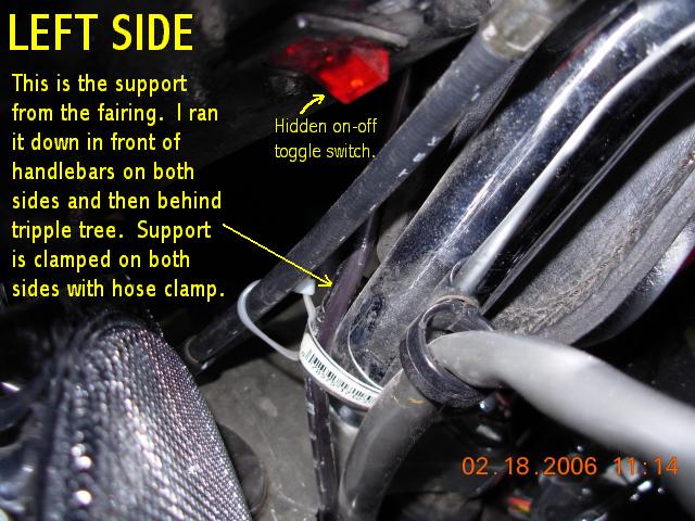 He drilled into the rear of the triple tree which made a nice easy wire run into the headlight bucket and the two switches are easy to reach while riding. Note this can only be done on bikes that have a hollow underside to the casting like the Vulcan 1500 Nomad/Classic. With a solid tree this probably wouldn't be too practical.