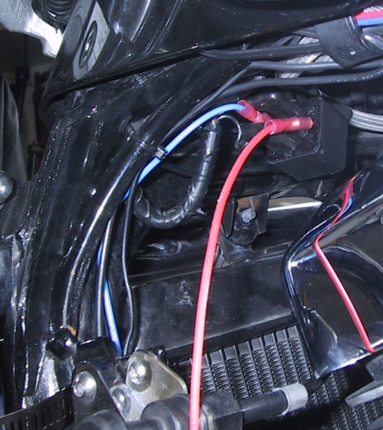 When the clamp is tightened around the frame upright and all wires are connected this is what you'll see when kneeling down and looking up under the tank for this particular install. Note all wiring has been covered by shrink tubing or hidden from view.