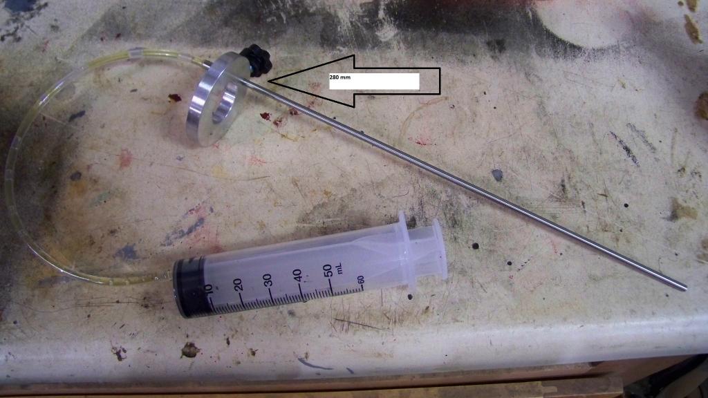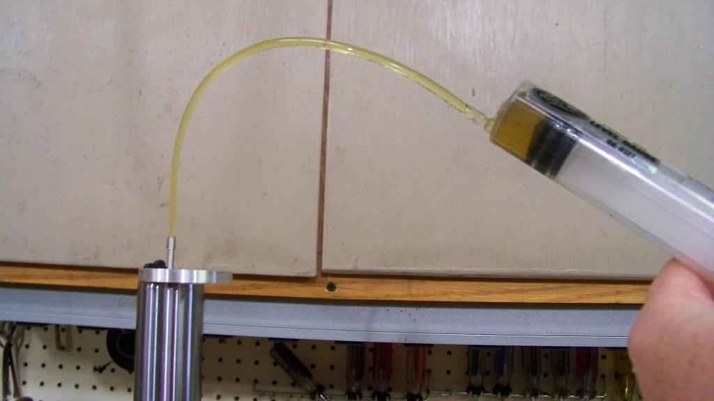 Now it's time to put your shock together. Put in the recommended amount of oil from the manual. A little too much is OK, you will adjust the level next. I put in 1 ½ cups of AW 32 hydraulic oil. This is SAE 10 weight. Pump the shock several times to make sure the oil is circulated. Next measure the correct HEIGHT of oil. This is the precise measurement. It is measured from the top of the shock to the oil, with the shock compressed all the way. I used a shock level gauge, but you could use anything you can think of to measure how far down the oil level. Spec is 280 +/- 2 MM for 800, and 169 +/- 2 MM for the 1500. To use the gauge, set the gauge height and put the nozzle down in the shock tube, and suck out any extra oil. When you get air, you're done. |