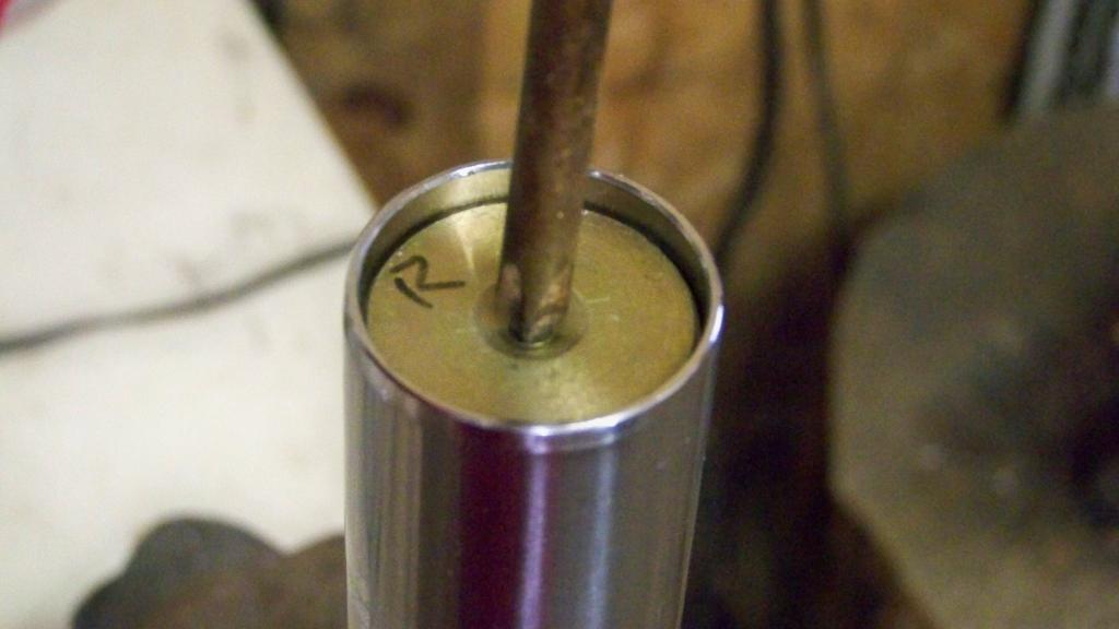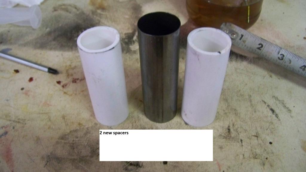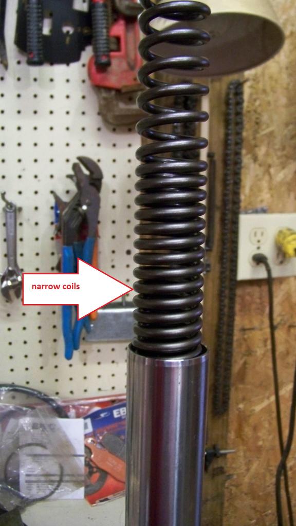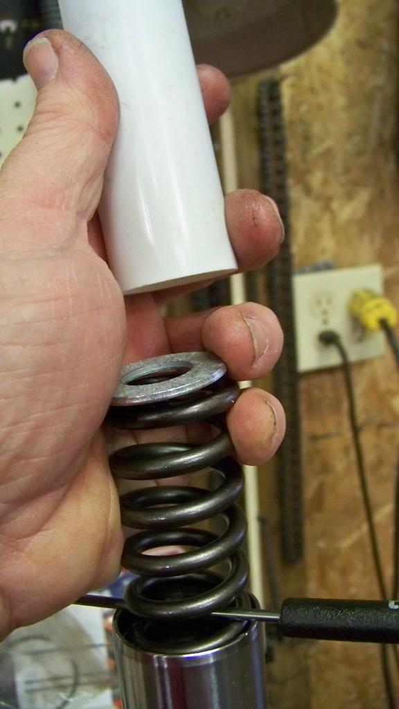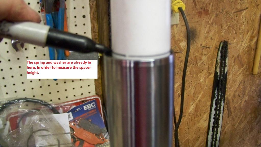 The next step is to put in the springs, followed by washers, then the spacers. The instructions say for a 1500, cut the spacers at 3 ½ inches (remember my kit was for a 1500), but there were no instructions for the 800. Through an email, Progressive said to cut them even with the top of the tube. So I measured and marked them that way, and they actually came out 3 ½ inches. Imagine that. Note, these are about ½” shorter than the stock spacers, giving me ½ LESS preload. I thought this is probably fine, since they are heavier springs anyway. |