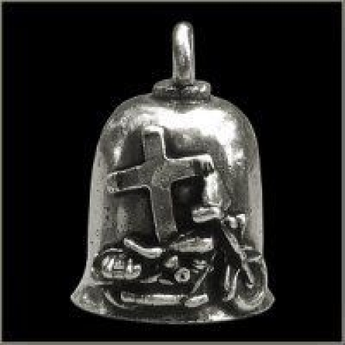 Description: Pewter bell with cross and motorcycle Gremlin Bell