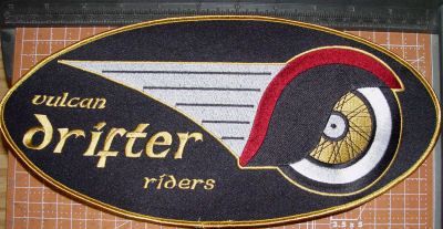Description: Vulcan Drifter Riders oval patch - medium - 6.5" x 5.5".