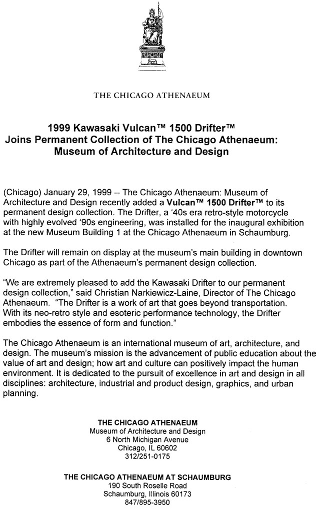 | Upon its introduction in 1999, the Kawasaki Vulcan Drifter motorcycle’s styling was selected for the Chicago Athenaeum: Museum of Architecture and Design’s permanent design collection. Displayed at the museum’s main building in downtown Chicago, the museum declared the Drifter “a work of art that goes beyond transportation. With its neo-retro style and esoteric performance technology, the Drifter embodies the essence of form and function.” |