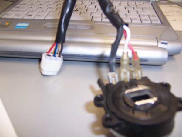 This is a close up of the connections to the Thunder Mfg. switch. You can see the red and the white wires. The heat shrink is hiding the infamous resistor on the third connection.