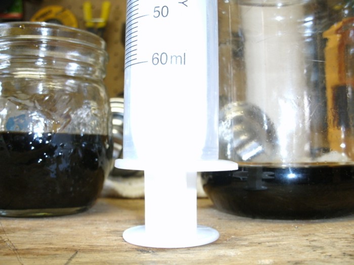 At this point you're wondering to yourself -- self, how much oil is inside the shocks anyway? I used a 60ml syringe to measure and I found that I had pulled 97ml out of the curbside and 93ml out of the roadside. Obviously a little had escaped from the left shock over the miles. We'll fix that.