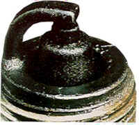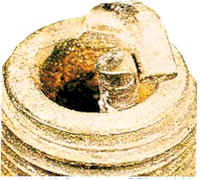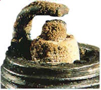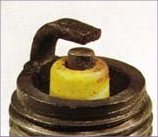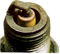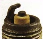 Insulator has yellowish, glazed appearance. Indicates that combustion chamber temperatures have risen suddenly during hard acceleration. Normal deposits melt to form a conductive coating which can causes misfiring at high speeds. Install new plugs. Consider using a colder plug is driving habits warrant. |