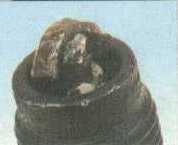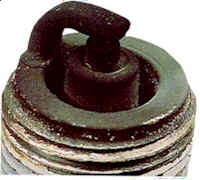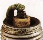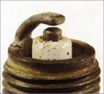 Insulators may be cracked or chipped. Improper gap setting techniques can also result in a fractured insulator tip. Can lead to piston damage. The explosion that occurs in this situation apples extreme pressures on internal engine components. Prime causes include ignition time advanced too far, lean air/fuel mixtures, and insufficient octane rating of the gasoline. Make sure the fuel antiknock values meet engine requirements. Use care when setting the gaps on new plugs. Avoid lugging the engine. |