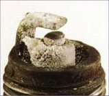 Melted electrodes. Insulators are white, but may be dirty due to misfiring or flying debris in the combustion chamber. Can lead to engine damage. Check for the correct plug heat range, over advanced timing ignition, lean fuel mixture, insufficient engine cooling and lack of lubrication. Usually one or a combination of several engine operating conditions are the prime causes of pre-ignition. It may originate from glowing combustion chamber deposits, hot spots in the combustion chamber due to poor control of engine heat, cross-firing (electrical induction between spark plug wires), or the plug heat range is too high for the engine or its operating conditions. |