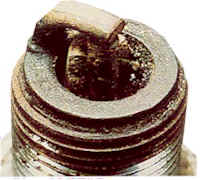Blistered, white insulator, eroded electrode and absence of deposits. Results in shortened plug life. This is often caused by over advanced ignition, timing, poor engine cooling system efficiency (scale, stoppages, low level), a very lean air/fuel mixture, or a leaking intake manifold. When these conditions prevail, even a plug of the correct heat range will overheat. Melting may also occur. Usually, the electrode surface is rather lustrous and uneven. Nickel alloys melt at between 2200 and 2400 deg.F. |