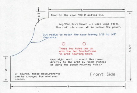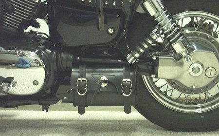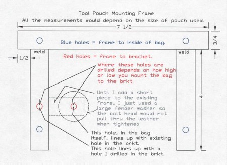 To hang a storage pouch: Make a 3 sided frame (Frame Plans Here) from 3/4in wide 16ga steel that mounts on the inside of the bag...then that bolts to the bracket which also hides the open space not covered by the bag. (Bracket Cover Plans Here) Be sure not to interfere with the side stand. And make sure it is out away from the drive shaft enough to clear it.